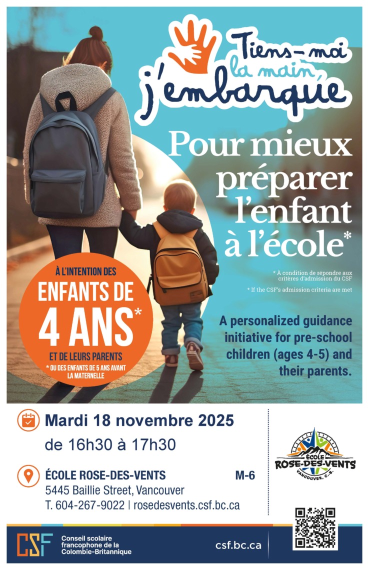 Nous vous invitons à inscrire votre enfant à l’école Rose des Vents ou l’Annexe Queen Elizabeth le plus tôt possible : consulter notre site pour compléter le dossier d’inscription.